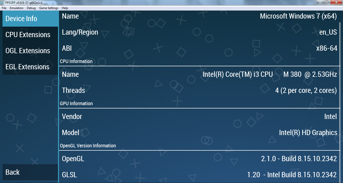 ShowFPSCounter = 3 RenderingMode = 0 SoftwareRendering = False HardwareTransform = True SoftwareSkinning = True TextureFiltering = 1 InternalResolution = 0 FrameSkip = 3 AutoFrameSkip = True FrameRate = 0 FrameSkipUnthrottle = False ForceMaxEmulatedFPS = 60 AnisotropyLevel = 4 VertexCache = True TextureBackoffCache = True TextureSecondaryCache = False FullScreen = False PartialStretch = False StretchToDisplay = False SmallDisplay = False ImmersiveMode = False TrueColor = True MipMap = True TexScalingLevel = 1 TexScalingType = 0 TexDeposterize = False VSyncInterval = False DisableStencilTest = True AlwaysDepthWrite = False TimerHack = True AlphaMaskHack = False SplineBezierQuality = 2 PostShader = Off MemBlockTransferGPU = True AndroidHwScale = 1 DisableSlowFramebufEffects = True From system just Fast Memory, Multithreaded, and I/O On Thread are on. |