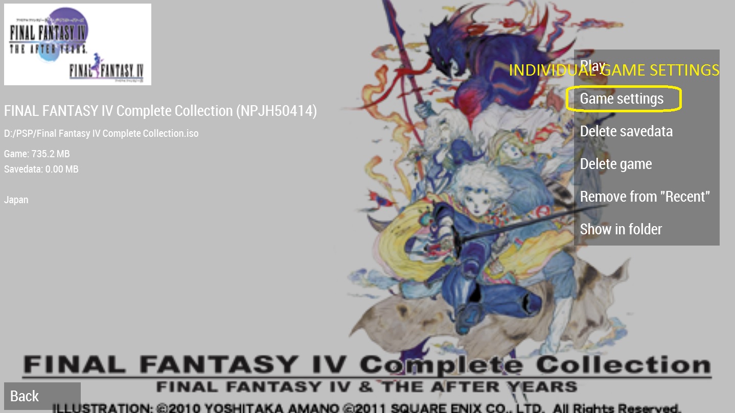 I have a suggestion for developers of PPSSPP. Is there a chance you could implement emulation settings for individual games? Some games need different rendering method, frameskip or certain functions disabled and that would be very convenient to have an option to use individual settings for every game instead of changing them everytime you switch to different games. Besides, there's already an interface for that, which is settings option in triangle/right click game menu. At the moment, that option has general emulation settings, but you can separate it and make settings in it individual for the game and general emulation settings can be accessed from settings option on startup screen with list of games. This is just an idea I had recently, but please, consider it. Thank you :3 My specs: Phenom X3 8450 ~2.3GHz PowerColor HD6850 1GB 4 gigs of DDR2-800 RAM ~400GB HDD Windows 8.0 x64 |