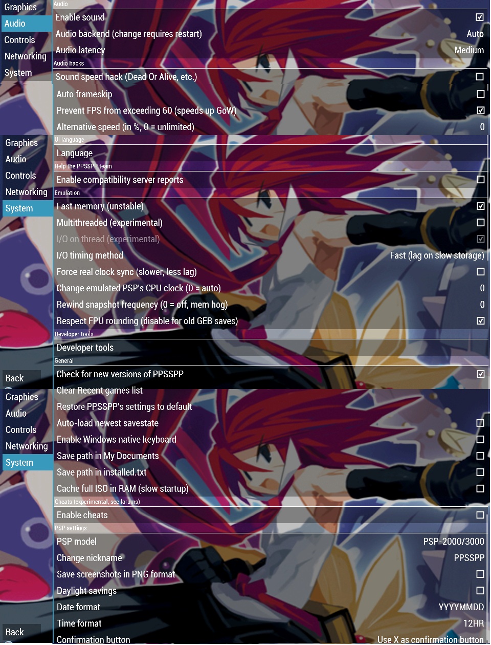 First of all, this happens quite irregularly, but when a combo goes on for long enough (I suspect about 8 or 9 in a row) the game would crash. Not that big of a problem, luckily. The other happens more often though, but far more in the second game. During cutscenes with voice-acting, the voices would randomly cut out, with the rest of the sounds still playing. This happens in about every cutscene in the second game, but doesn't happen as often in the first game. It appears to happen during particularly long cutscenes (such as the first one) or when you've seen a cutscene, play a bit of the game and do another cutscene. Strangely, it appears to fix itself (briefly) when I reset the emulator with ctrl+B. I haven't heard anyone else about this, so I suspect it's an emulator issue, but I can't find anything that would cause this to happen. Does anyone have any idea? My specifications and settings are: OS: Windows 7 64-bit Version ppsspp: v1.0 64-bit As for the emulator settings, these images ought to tell it best. Graphics Audio and System |