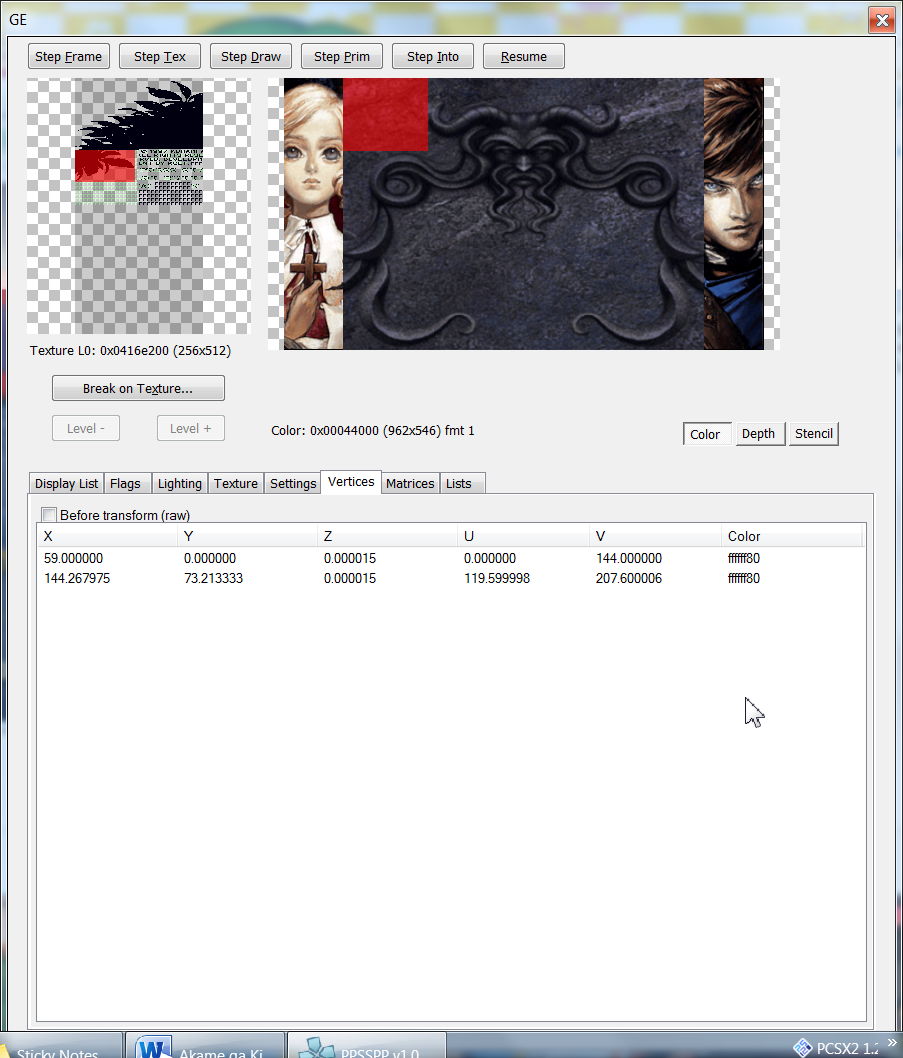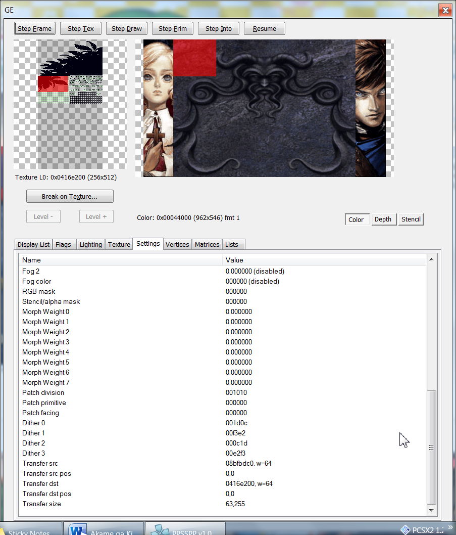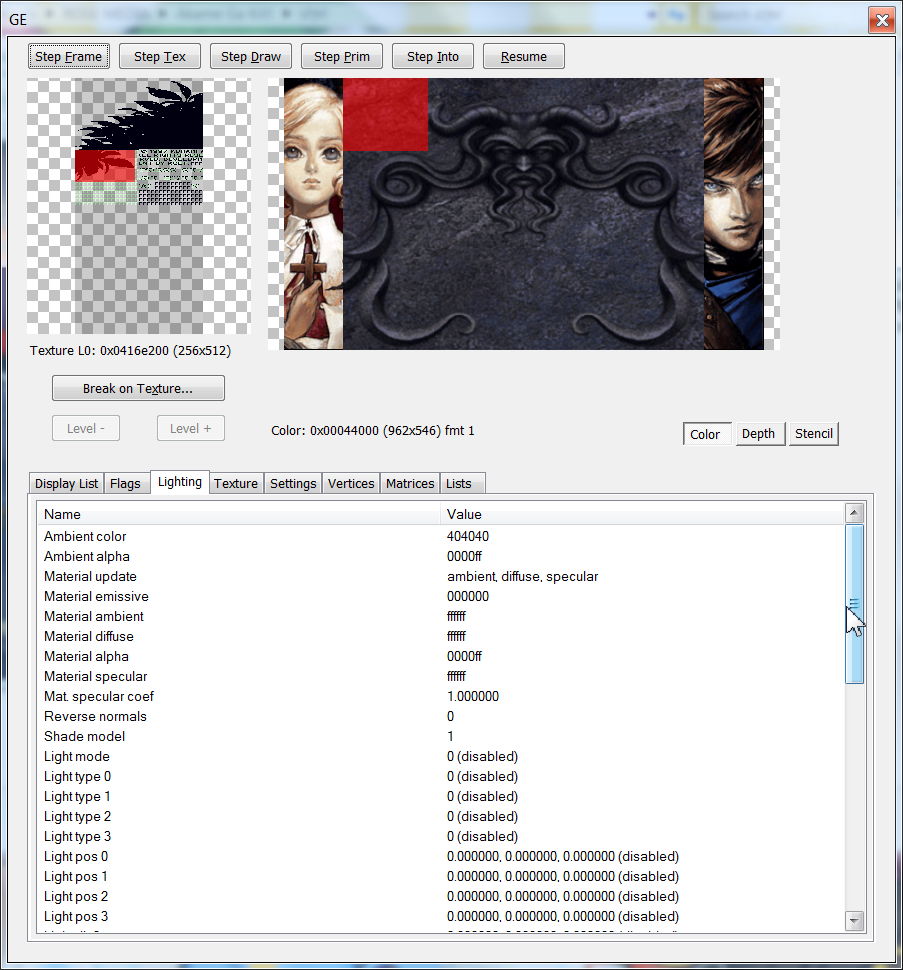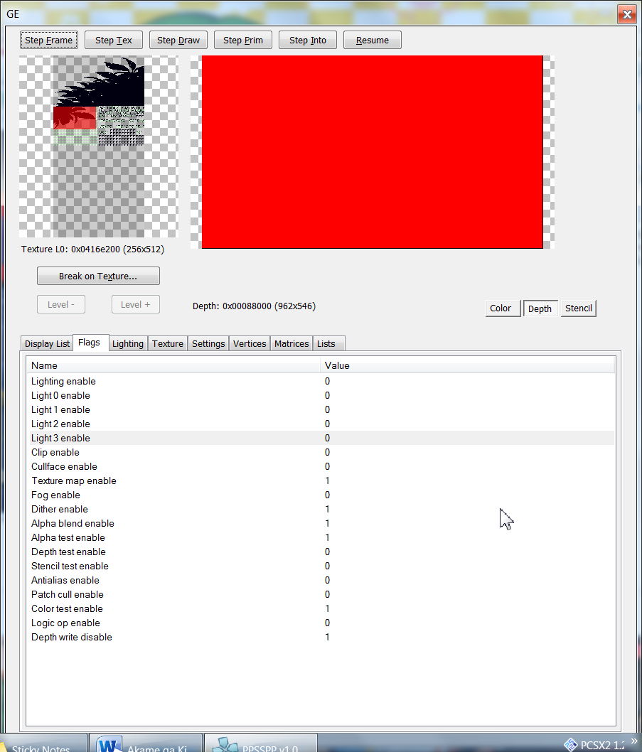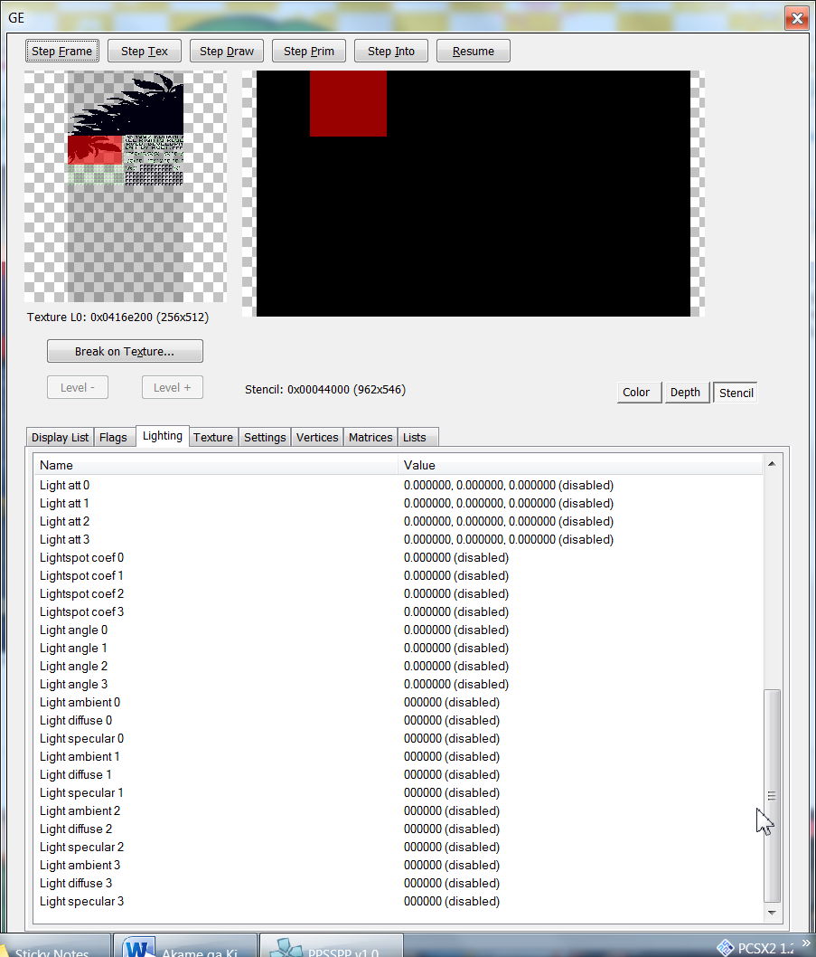 This happened when the drawer was drawing the "Tree shadow" texture and I double-clicked "Color test enable 1" to 0 (turn it off) But the difference is, I still can see it as transparent while the one on my phone is plain black. Oh, and your idea on submitting GE was nice, except the "Display List" tab doesn't allow me to Ctrl+A it ![]() That tab must be Screen-captured only I guess.... |
