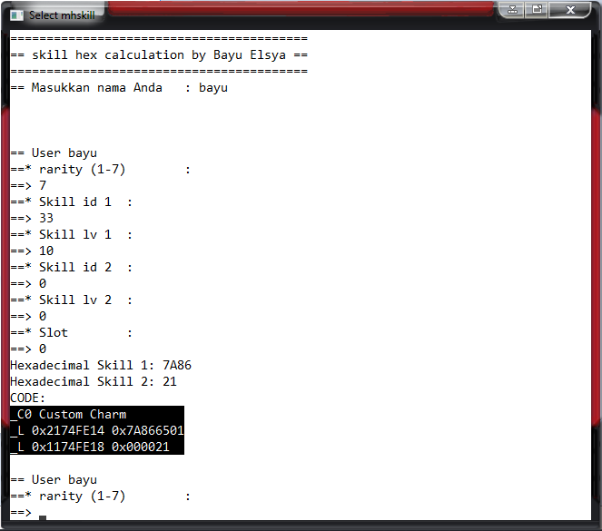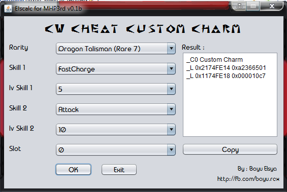 (08-07-2014 02:25 PM)LunaMoo Wrote: Someone requested code to change hp to 10, wasn't sure if he wanted to trigger some bonus or be hardcore so I made both: I made a simple application to calculate the hex for CUSTOM charm cheat custom charm calc : http://www.mediafire.com/download/7w2tkg...5/v0_4.rar ♦ Nick Evolve MHP3rd Online : elsyarex ♦ Sorry if my English is bad, I'm Indonesian! ;-) ♦ I only use Windows versions of PPSSPP. win 7 x64 rog Nvidia GT540m vram 2GB RAM 2GB |