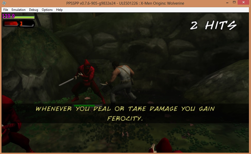 Genre: Action / Hack'n'Slash / Beat'Em-Up Region: USA (NTSC) Game ID: ULUS10411 [More detail] Format: ISO Version of PPSSPP: v0.8.1-612-gdf89065 (yes, old one - read below why I used this version) Emulation system: Windows XP SP3 32-bit Compatibility: Playable (Player can complete game at 100%) Review: Works awesome. It has only one nasty bug with in-game saving. Everything else works very-very good. Video: Excellent. Every video and cut-scenes works without glitches or issues. Sound: Music and SFX works good. No distorts or slowdown. Graphic: No textures and models bugs. Every text shown without errors. FPS: Stable 55-60 FPS. Player can play without problems. In some places with heavy visual effects (snow, smoke e.t.c) FPS can down to 40-45 Savestate: No errors. In-game save: Do Not work. Game-explorer creates savefile on memory card but game itself do not reading it. Tried using different setting - no way to make it work, every time game says: "savefile do not present". Autosave do not work too. After every mission game said: "Saving" and show no errors, but truely - no saving, only blank savefile. I start to play this game on PPSSPP v0.8.1-612-gdf89065 and had using only savestates. When I discovered this "save-bug" I can't change PPSSPP build due my savestates do not work on new versions (it is old) and do not have regulary save on memory card. DLC: No DLC for this game. Settings: I.Quick review: Code: Buffered Rendering - on. (You have FPS problem? Switch off this)II.Detail rewiew: Buffered Rendering - This option makes graphic more brighter and "light-looking". But you can switch it off - this do not affect game very hard. Check this pic to compare on and off settings. Hardware Transform - This one decreasing FPS. Switch it off Read framebuffers to memory - Do not affect game's graphic or FPS, but better to switch on when you using Buffered Rendering Vertex Cashe - This one decreasing FPS. Switch it off Use VBO - This one decreasing FPS. Switch it off Frame skipping - Good option which creates more FPS. Use this when you have major problems with FPS. Simple 2X SSAA - Use it for better graphic expirience and fast PC (or device) MipMapping - Seems no effect. Better to switch off. Vsync - This one decreasing FPS. Switch it off Texture Filtering - Better to use linear - this smoothing game Texture Scaling - This one decreasing FPS and decreasing graphic. Switch it off Screenshots: ![]() Bugs and issues: 1) Main bug - do not work in-game saving/loading P.S. Dear moders, please change status of this game in compatibility list. Now it is PLAYABLE, not: Quote:X-Men Origins: Wolverine - ULUS10411 - [menu/intro] |