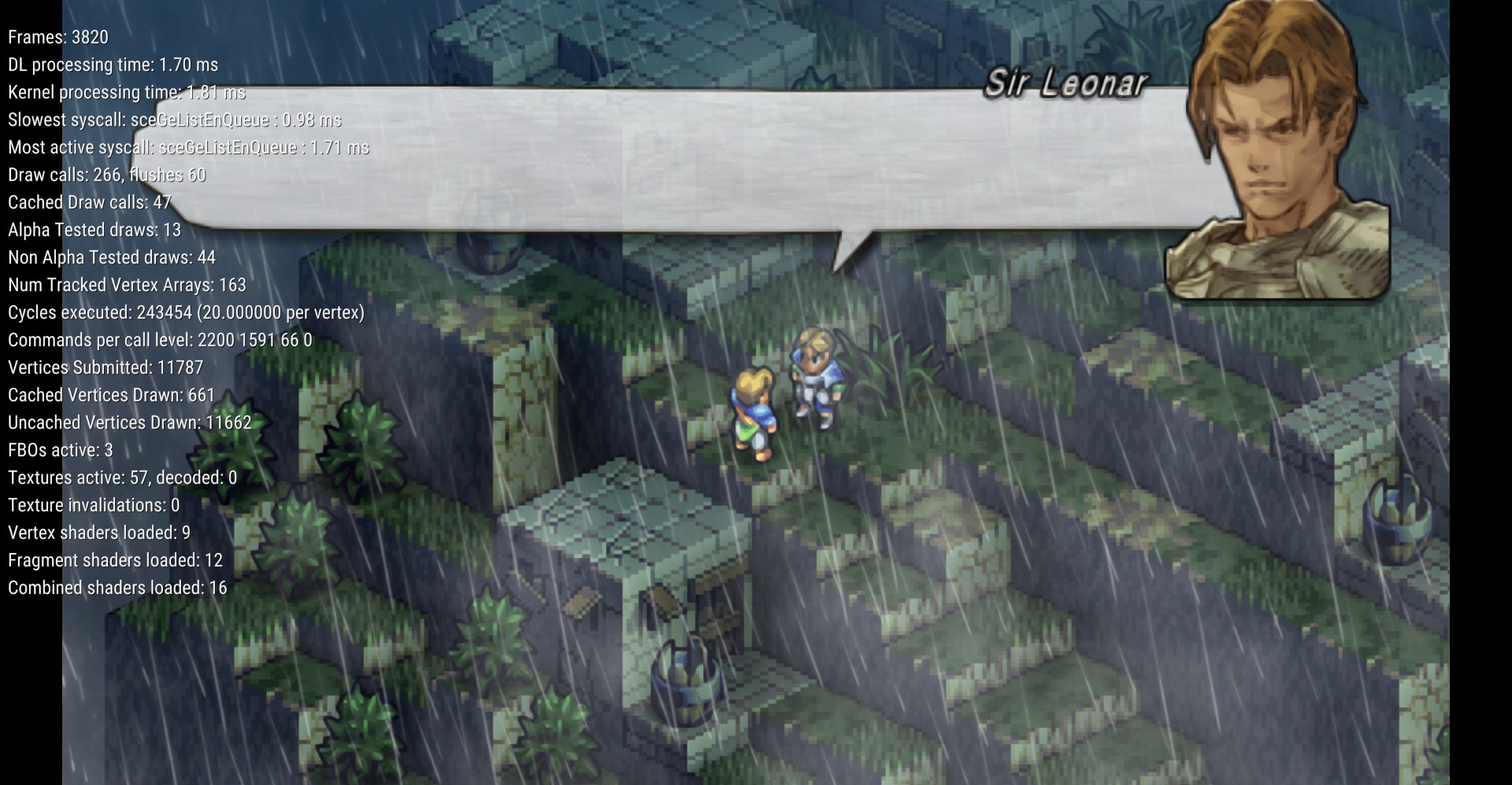 Recently started using PPSSPP and tested Tactics Ogre Let Us Cling Together (awesome game by the way). Well I'm using Texture scaling for some smoothed out sprites and terrain. It all looks really good, but sometimes, out of nothing (usually after some effects or after I open the party menu in battle) background textures (i.e. terrain) starts looking like no scaling was applied. The character sprites still look smoothed, but the ground starts to look pixelated and blocky. I noticed that after I change the scaling settings back and forth a few times it starts fully working again. I searched the forums but couldn't find any new posts on the topic. Anyone knows why this happens? Also is there some fix or some option I must turn on/off to make the texture scaling work propperly? Thanks in advance Edit: added screenshots: the first one is the one in which the scaling seems to be working correctly. After one in game scene the background comes back like that (screenshot number two) System Specs: Operating System: Windows 7 Professional 64-bit (6.1, Build 7601) Service Pack 1 (7601.win7sp1_gdr.141211-1742) Language: Portuguese (Regional Setting: Portuguese) System Manufacturer: System manufacturer System Model: System Product Name BIOS: BIOS Date: 12/17/12 14:10:32 Ver: 12.03 Processor: Intel® Core i5-3330 CPU @ 3.00GHz (4 CPUs), ~3.0GHz Memory: 8192MB RAM Available OS Memory: 8140MB RAM Card name: NVIDIA GeForce GTX 650 Ti Manufacturer: NVIDIA Chip type: GeForce GTX 650 Ti Display Memory: 4043 MB Dedicated Memory: 971 MB Shared Memory: 3072 MB |