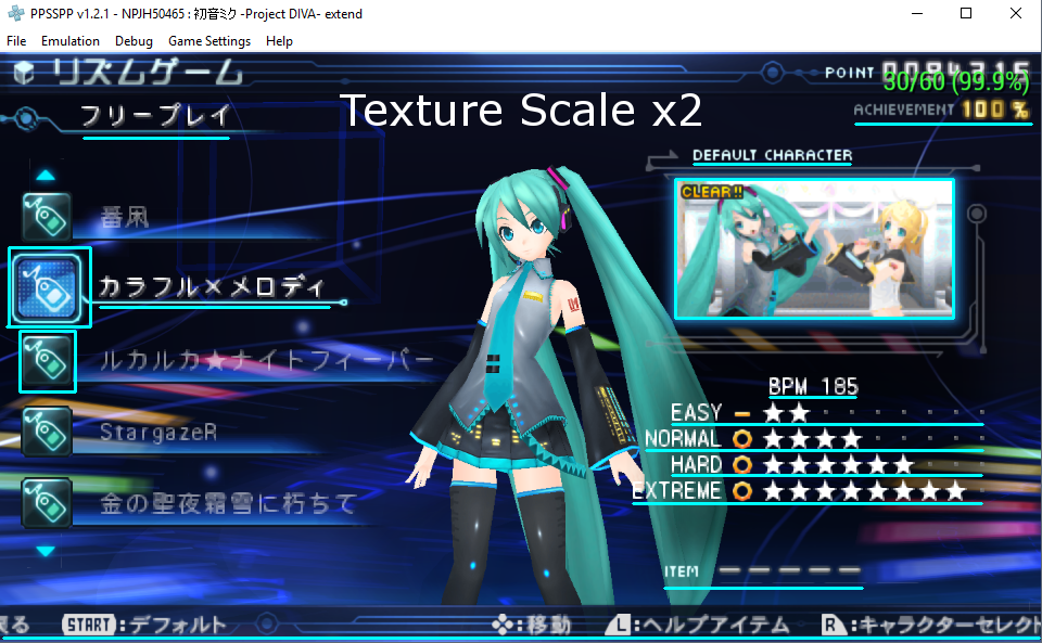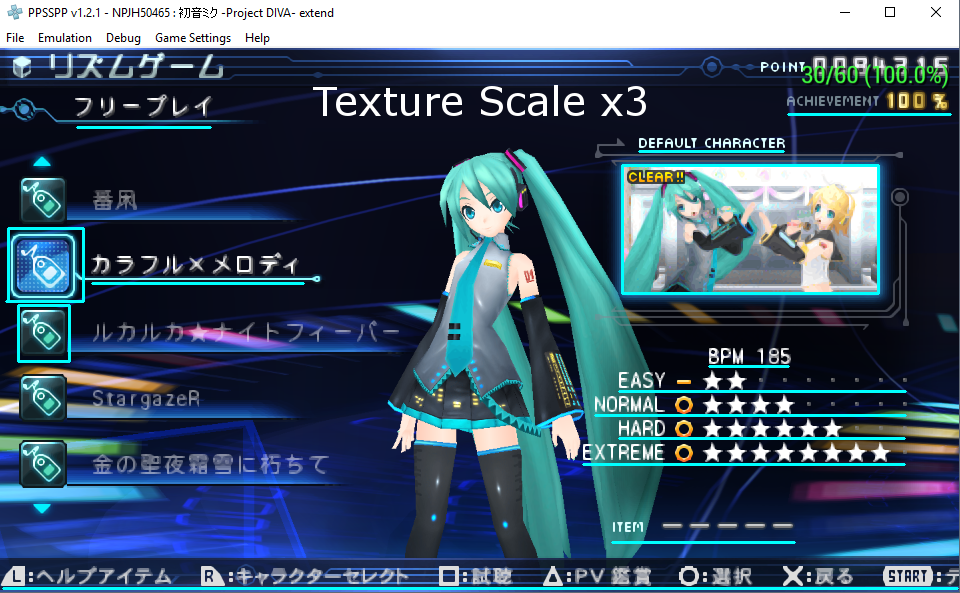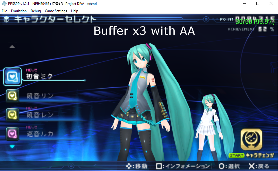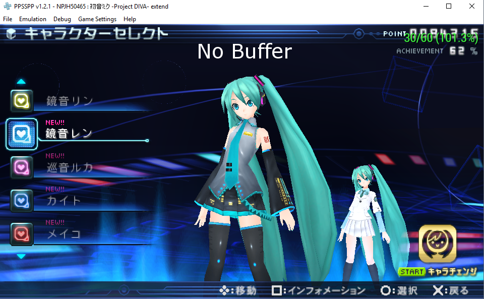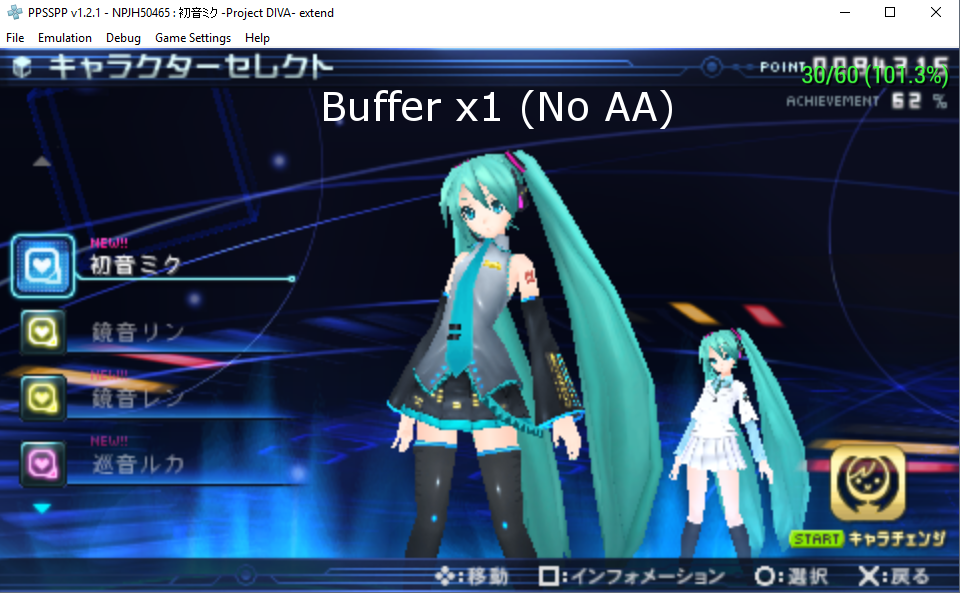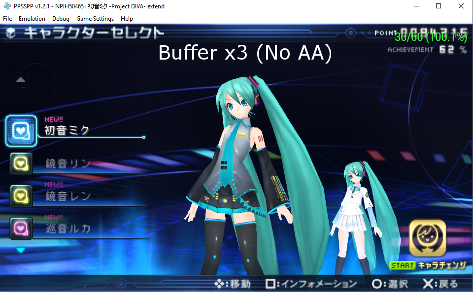 First of all, my rig is awful, so chances are you can do much better then my settings: Windows 10, Intel Celeron N3050 (1.6ghz dual core, 2.1ghz turbo), 4GB Ram, 500gb HDD, 1336x768 screen About Intel Turbo: Something to bear in mind from my experience is that 1.6ghz out of an Intel CPU on a built in GPU is not enough to run this game. Due to the lack of multi-thread support for the time being, you'll need a much better processor 60FPS: All the PSP games will inherently run at 30FPS. While it's playable by all means, you'll have a better time trying to get perfects and high scores in a 60FPS mode. However, you may end up reducing your settings in order to get it working. 1: Close PPSSPP, locate the PPSSPP folder on your system 2: Go to the folder: PPSSPP>MEMSTICK>PSP 3: Create a new folder here named "Cheats" (without quotes) 4: Open PPSSPP and goto Settings>System, then Enable Cheats should be turned on 5: Open the Project Diva game you wish to add cheats to 6: Close PPSSPP and go into the Cheats folder you had created. There should be an INI file in there now 7: Open the INI file (Notepad or any text editor can do this) 8: Depending on your Miku title, paste one of the following lines of code below into your INI file. 9:Open game in PPSSPP again, play it, pause, then go into the cheats menu. If the cheat doesn't show up: 1) Make sure the INI file saved and isn't blank. 2) Check and see if you put the right Cheat code into the right INI folder Hatsune Miku: Project Diva _C1 PD 60 fps _L 0xE0011420 0x001D1BA2 _L 0x201D1BA0 0x10000003 _C0 60 fps [Disable] _L 0x201D1BA0 0x14200003 Hatsune Miku: Project Diva 2nd _C1 PD:2nd 60 fps _L 0xE0011420 0x0018C166 _L 0x2018C164 0x10000003 _C0 60 fps [Disable] _L 0x2018C164 0x14200003 Hatsune Miku: Project Diva Extend _C1 PD:Extend 60 fps _L 0xE00101F8 0x002DC91C _L 0x202DC91C 0x34040001 _C0 60 fps [Disable] _L 0x202DC91C 0x8E0401F8 Texture Scaling Off for best performance, possibly can make the game look much better if on. This being set on can cause songs to regularly lag if your GPU isn't capable of the much faster writing speed it's expected to account for. If you suspect lag, play the song again, note where your FPS drops. If it drops on those spots consistantly, then lower or turn off Texture Scaling. Examples below in the attachments. Buffering, Anti-Aliasing, and Rendering Resolution Non-Buffered Mode: Game will automatically render at the highest resolution your monitor is capable of rendering. This can prove significantly faster then any buffered mode, but looks the worst when rendering distant models, and forces the menus and loading screens to flash black regularly. Quality in Buffered Mode: No Anti-Aliasing: For sharper character models, use a rendering resolution 1 times higher then your window size (1x Window means 2x Resolution, where 3x window means 4x resolution). This renders character models without blurring resulting from using Anti-Aliasing, however, increasing the Resolution by one uses more processing power then anti-aliasing the lower resolution. Anti-Aliasing: As above, but turn on Anti-Aliasing as well. Rendered models will look much better in screenshots and when rendered from farther away, but will slow the game down somewhat. Examples below in attachments. General Settings Throttle: Set a keybinding to Throttle. Use this to dramatically reduce the length of time spent booting or loading the game. Frameskip: Highly ill advised. Anything below 30FPS will have extreme stutter and constantly drop commands. Set to auto, game lag will be replicated to real-time instead of slow down, but still drops commands badly and harder to feel for, unlike without the frameskip, Ansioscopic Filtering: The difference between having this off or set all the way to 16x is somewhat unnoticable graphically and CPU wise. You can set it to the max of 16x and leave it there. Audio Latency: Set to Medium. There may be cases of audio de-sync at Low latency. Fast Memory: Set to on. Will ignore checks and assume all memory reads are correct. Performance should be increased. Only reason to not use this is if you experience any crashes when using it (likely ones you can replicate), in which case turn it off. Multithreaded: Turn off. In basically every case this makes the game unplayable with endless frame sync issues. Cache Full ISO in RAM: Keep off. This allows the game data itself to be read very fast, but everything needs to be written into the memory in the first place. If you're really interested in the absolute most speed, get a 3.0 USB Flash Drive to store the whole game on, maybe even PPSSPP too. If you're on a phone, this is irrelevant because flash memory is far more available and cheaper on phones. Show FPS/Speed: Very useful for noticing problems. FPS changes sometimes will relate to a stutter in frames, but less so when running 60FPS. If you use the throttle keybind, then speed will tell you exactly how much the faster the game is performing. (Unconfirmed) I/O on Thread: On and set to Fast. May increase the speed of the game. (Unconfirmed) Change Emulated PSP Clock: Set to to 333mhz. Possibly increases the stability of PPSSPP. While an oddly low number, this is the power of the PSP and will run games more accurately. Other possibilities are to run at 222mhz or lower. Game can become unstable if you attempt below this however. (Unconfirmed) There may be a benefit to Frameskip set to 1 if you are running in 60FPS cheat. The theory stands that the game will either: 1: The game will no longer speed up trying to correct an FPS drop, because it can run at an FPS higher then 30 without issues. 2: When the game lags, the Frameskip will correct it by rendering a half frame, keeping a relative 30FPS. |