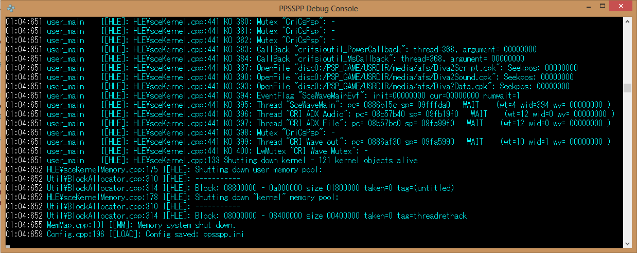 (04-15-2013 06:21 AM)thedicemaster Wrote: this game already has a topic at http://forums.ppsspp.org/showthread.php?tid=1254 the thread name was "hatsune miku project diva 2" and what i search was "hatsune miku project diva 2nd" no wonder that i cant find that yeah every display become normal after i disabled them, thanks about that save game bug it only occured to me if i used my save data from jpcsp, theres a dialogue box saying "cant load extra data" but after i overwrite it there's no problem after that I got new issues here, it didnt happened for few days but now everytime I finished a song the screen goes black (crash?) and i had to close the PPSSPP but the data was saved so it wasnt fatal but still annoying. I didnt know why but maybe because i change a setting? look the log data at the attachment |