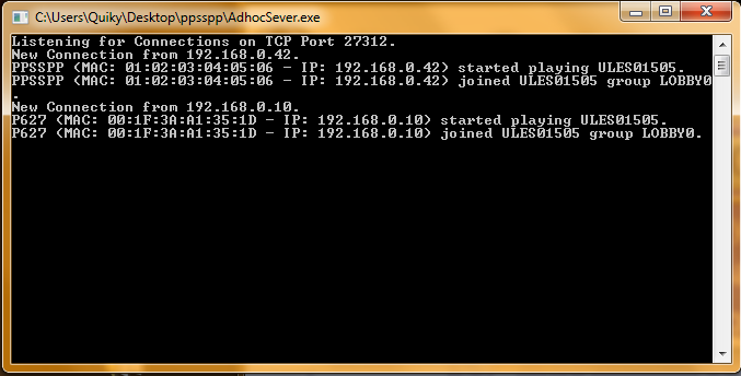 Oui effectivement je viens de voir l'erreur je l'ai rectifié. Cependant maintenant les deux se connectent mais ne peuvent pas se connecter en même temps. Imaginons que je connecte le pc ppsspp d'abord. La psp va rester bloquer sur Connecting lobby. Et inversement si je connecte la psp d'abord. L'emullateur va à son tour rester bloquer sur Connecting lobby.
