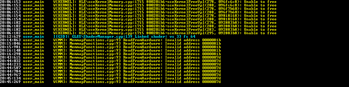 (08-03-2014 05:08 PM)solarmystic Wrote:(08-03-2014 04:12 PM)Nightquaker Wrote: Update: settings didn't work, at least as far as Fast Memory and I/O thread toggle. Here's the log. Unable to free spam all the time, Invalid address 0000007d appears every time I press X on result screen. Here's more detailed "Unable to free" part with all sorts of different addresses http://pastebin.com/Yy622TcL My specs: Phenom X3 8450 ~2.3GHz PowerColor HD6850 1GB 4 gigs of DDR2-800 RAM ~400GB HDD Windows 8.0 x64 |