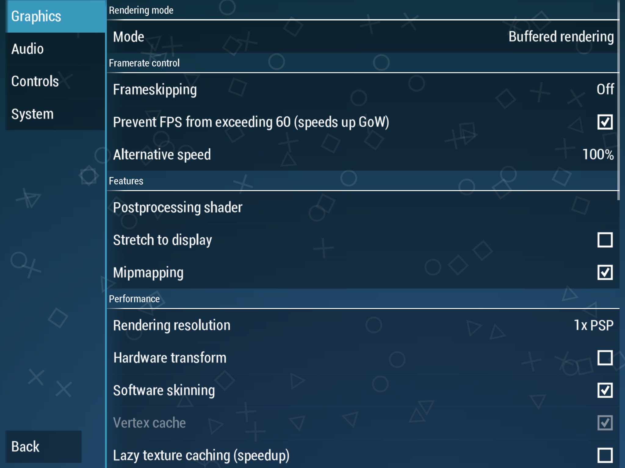 7. Play at only 1x or 2x rendering resolution. (Note:- Applies to both Android and Windows now since v0.9.1-752-g2745744 which seperated Window Size and Rendering Resolution.) (Note 2:- Changing the rendering resolution will only work if Rendering Mode is set to Buffered Rendering. Non Buffered Rendering Mode will just lead to the image being displayed in your device's/window's native resolution. E.g. If your device can output 1080p, and you set it to Non-Buffered Rendering, the game will render in 1080p no matter the rendering resolution set in the options. You'll have to set it back to Buffered Rendering, and then, change the Rendering Resolution to whatever you desire.) (TL: DR, Choose either a low rendering resolution (1xPSP or 2xPSP) coupled with Buffered Rendering Mode OR just Non-Buffered Rendering mode, and compare the performance for yourself. You can't have both Non-Buffered Rendering Mode AND the choice of your rendering resolution at the moment.) |