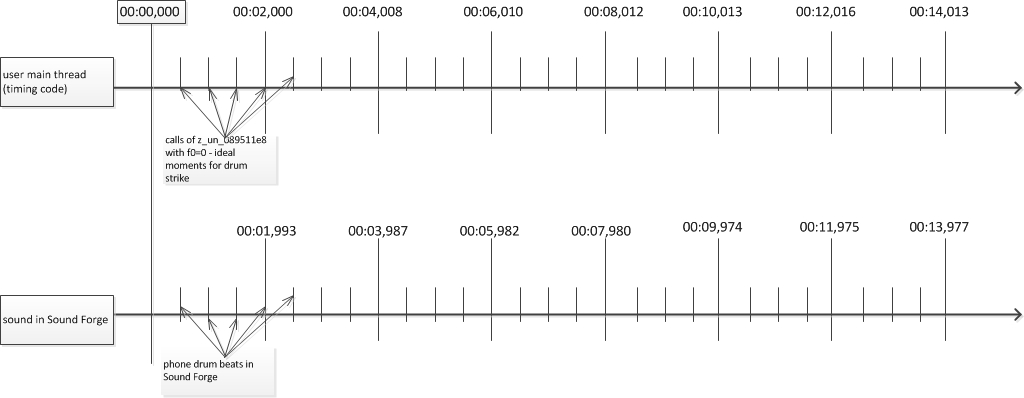 This picture shows that there is little difference between execution speed of main thread and music the player hear. For example, time of background "boom" of 5th tact is 00:07,980. But time of call of get_current_timing() whit f0=0 in game is 00:08,012