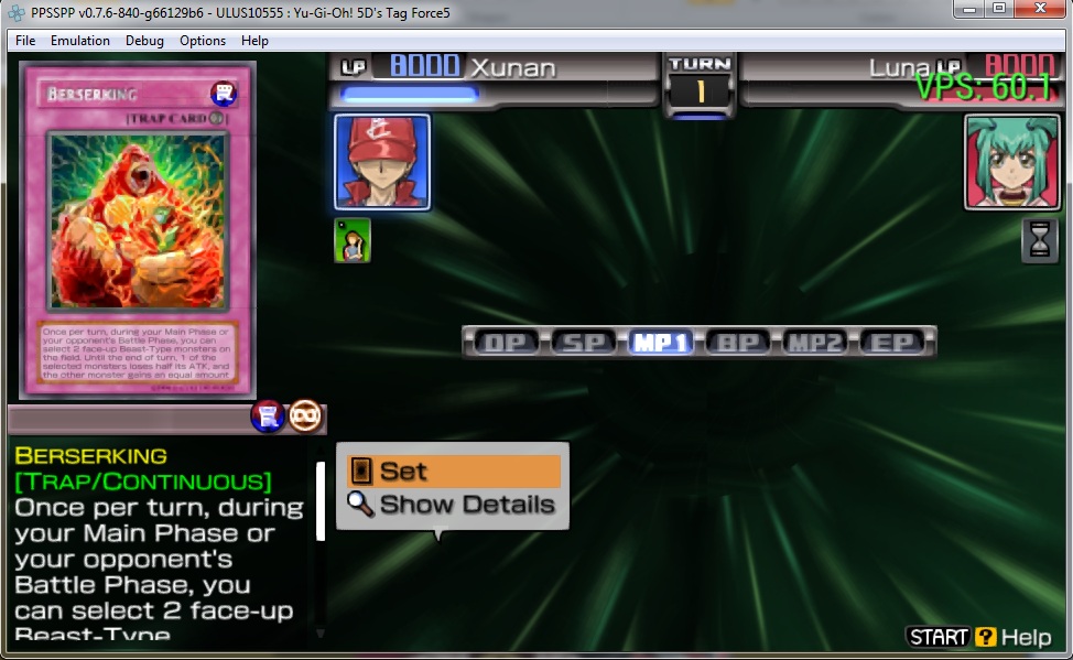 Genre: Card Battle Region: US GameID : ULUS10555 Format: ISO Version: v0.7.6-840 OS: Windows Compatibility: in game Notes: Missing BGM only, game stuck with permaloading after 1 action. eg, after ended 1 duel (free duel mode);after selecting place to go (story mode), card in-hand invisible when dueling |