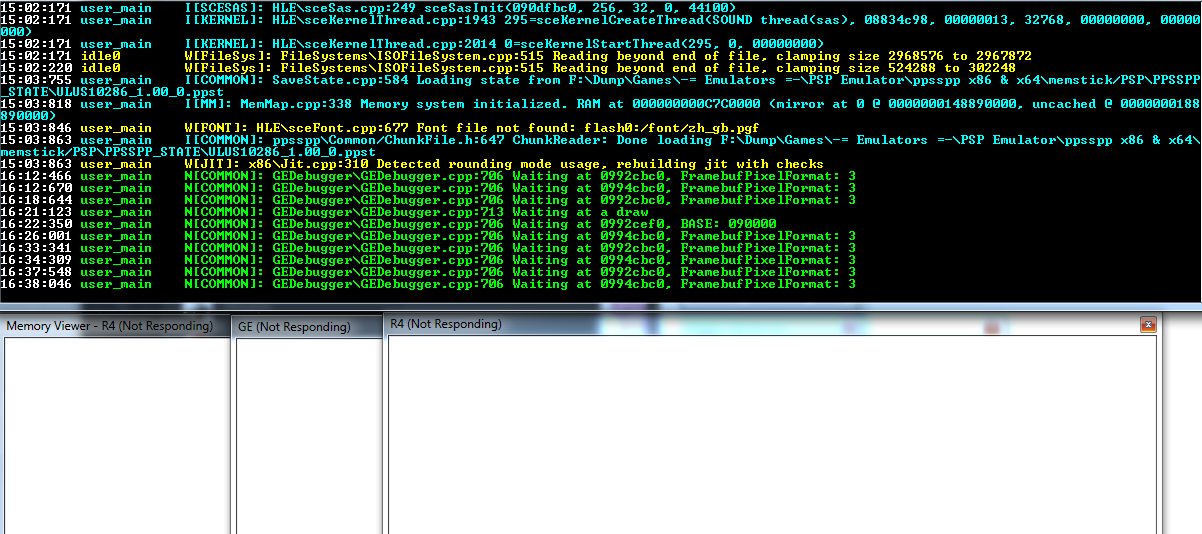 Firstly the crash still occurs after the Atlus logo loads and I select the X button to skip it. However the REX anomaly no longer displays in the logs upon the crash. I am going to have to download another copy of the game temporarily as my friend is currently out of the country with my psp, or just wait for him to return late April. Another thing I noticed was that I had a savestate I could load and I knew how to initiate the crash from within the game as well. I open the start menu while my character is in an area. So using this information I opened all the debuggers and memory viewers just in case, had the game motion forward frame by frame as I push the start button, but alas, I could not get anything useful out of it due to the crash not being able to store window state. The crash occurs at the very bottom of the log file without writing a new entry. |