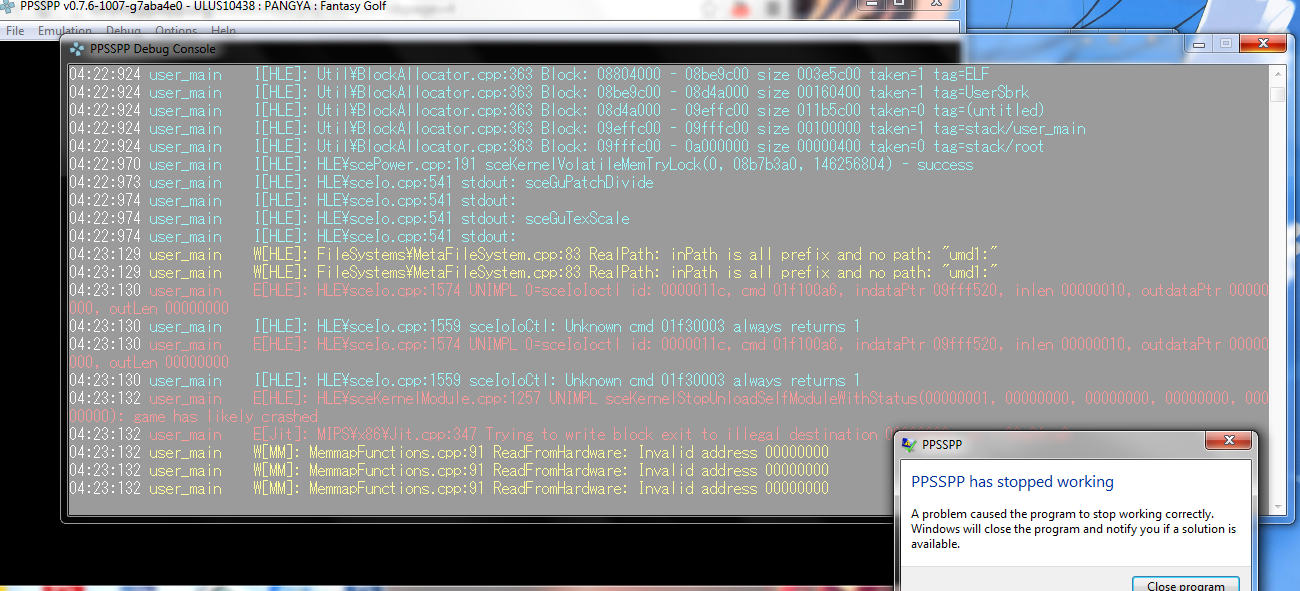 42:16:643 user_main E[HLE]: HLE\sceIo.cpp:1574 UNIMPL 0=sceIoIoctl id: 0000011c, cmd 01f100a6, indataPtr 09fff520, inlen 00000010, outdataPtr 00000000, outLen 00000000 42:16:643 user_main I[HLE]: HLE\sceIo.cpp:1559 sceIoIoCtl: Unknown cmd 01f30003 always returns 1 42:16:643 user_main E[HLE]: HLE\sceIo.cpp:1574 UNIMPL 0=sceIoIoctl id: 0000011c, cmd 01f100a6, indataPtr 09fff520, inlen 00000010, outdataPtr 00000000, outLen 00000000 42:16:643 user_main I[HLE]: HLE\sceIo.cpp:1559 sceIoIoCtl: Unknown cmd 01f30003 always returns 1 42:16:711 user_main E[HLE]: Util\BlockAllocator.cpp:271 BlockAllocator : invalid free 093af1e8 42:16:711 user_main W[HLE]: HLE\sceKernelMemory.cpp:1191 800201b6=sceKernelFreeVpl(278, 093af1e8): Unable to free 42:16:711 user_main E[HLE]: sceKernel.h:446 Kernel: Bad object handle 0 (00000000) Is your DirectX and Graphics Driver up to date? Or is the game working for you on older builds(no older than 7.6-961)? |