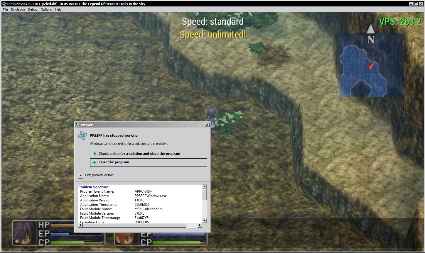 (06-02-2013 08:56 AM)kivakabuto Wrote: well i play to chapter 1 when iam at bose, and some time emu will freeze when you want to save, but its rare to happen Confirmed on revision 0.7.6-1161-windows-x86 There are random crashes which occur that seems to be related to the at3plusdecoder.dll. It happens for me post battle, after a few enemy encounters in the game. Wierdly enough this does not occur on the same 64bit build. EDIT:- Managed to capture one of those crashes in a screenshot and a logfile while I was looking for it during gameplay. Screenshot and logfile attached. EDIT2:- Github issues page made to increase awareness:- https://github.com/hrydgard/ppsspp/issues/2126 PPSSPP Modern Testbed:- Intel Core i5 4690K @ 4.0 GHz NVIDIA Geforce GTX 760 2GB GDDR5 VRAM @ 1138/6500 Mhz 16 GB DDR3 RAM @ 1600 MHz Windows 7 x64 SP1 PPSSPP Ancient Testing Rig:- Intel Core 2 Duo T9550 @ 2.8GHz ATI Mobility Radeon 4670 1GB GDDR3 VRAM @ 843/882 MHz 8 GB DDR3 RAM @ 1066 MHz Windows 7 x64 SP1 |