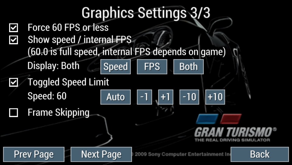 Well, after disabling Buffered Rendering, Vertex Cache, MipMaping and enabling Frame Skipping it gets pretty much playable, except for the unreadable text. Of course, it isn't smooth the whole time and some tracks have sections were the emulator start blinking with black interframes. Interestingly enough, the longer tracks (Nürburgring Nordschlaife and Circuit de la Sarthe) are the ones that worked better for me, having perfectly playable FPSs almost the whole lap. Also, the emulator doesn't seem to take all available resources (CPU and GPU don't reach 100%) with Gran Turismo, when I play Armored Core 3/SL/LR Portable or Whipeout Pulse it often does, just saying...