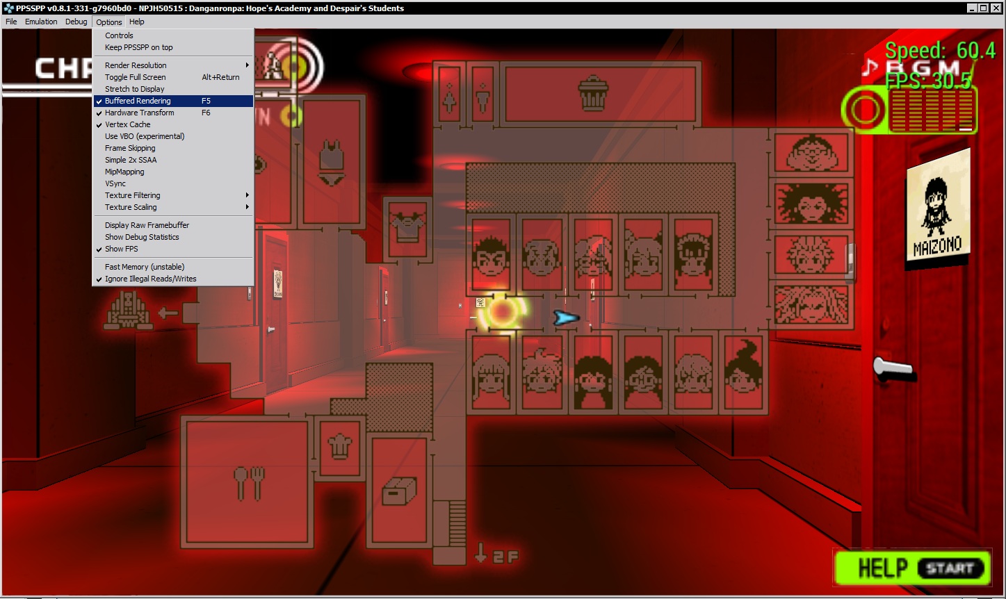 So I'm having this really weird and annoying pair of glitches trying to play Danganronpa. Firstly, I had it working fine under the settings I set, and no major issues were found that couldn't be solved. But the problem now is that I just began the Climax Logic of Chapter 4, and this screen pops up. I've done other Climax Logics, and I didn't fiddle with the settings that had worked for me before (I don't think anyway), and now I can't play the game. So I load up a previous savestate and keep trying, but eventually the same thing keeps happening, and now my savestate is tied directly to the glitches location ingame.