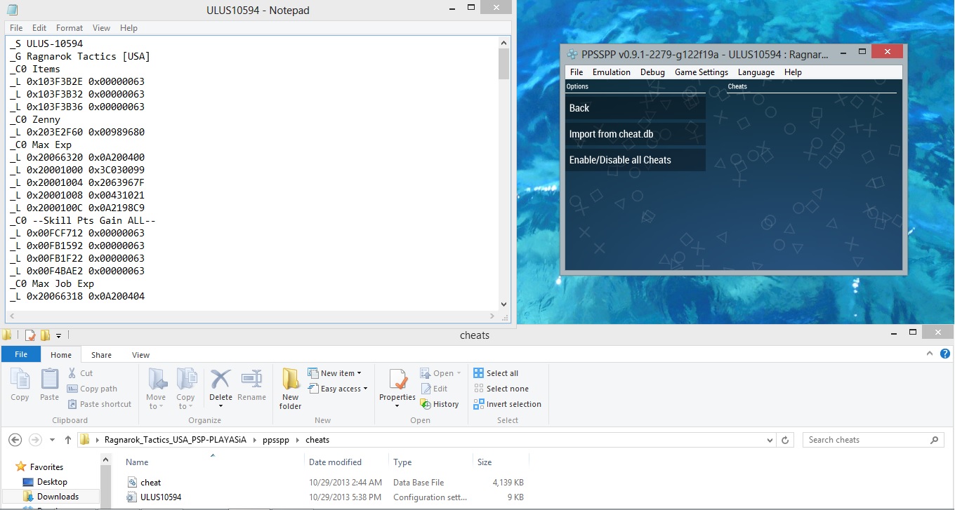 First of all, I already visited http://forums.ppsspp.org/showthread.php?tid=3590 .. and i did the exact same thing and still have a problem. Since many people said that it works fine now, then i guess the problem is related to the game. I use PPSSPP v0.9.1-2279-g122f19a. I am trying to put some cheats for Ragnarok Tactics [USA] [ULUS-10594], but every time i try to import cheat.db to the emu nothing happens. Also, I have put all the cheats in ULUS10594.ini file and still cant see them when i open the cheat menu in the ppsspp. Is there a problem with the emu, or am i missing something. I attached a pic btw to find the problem. |