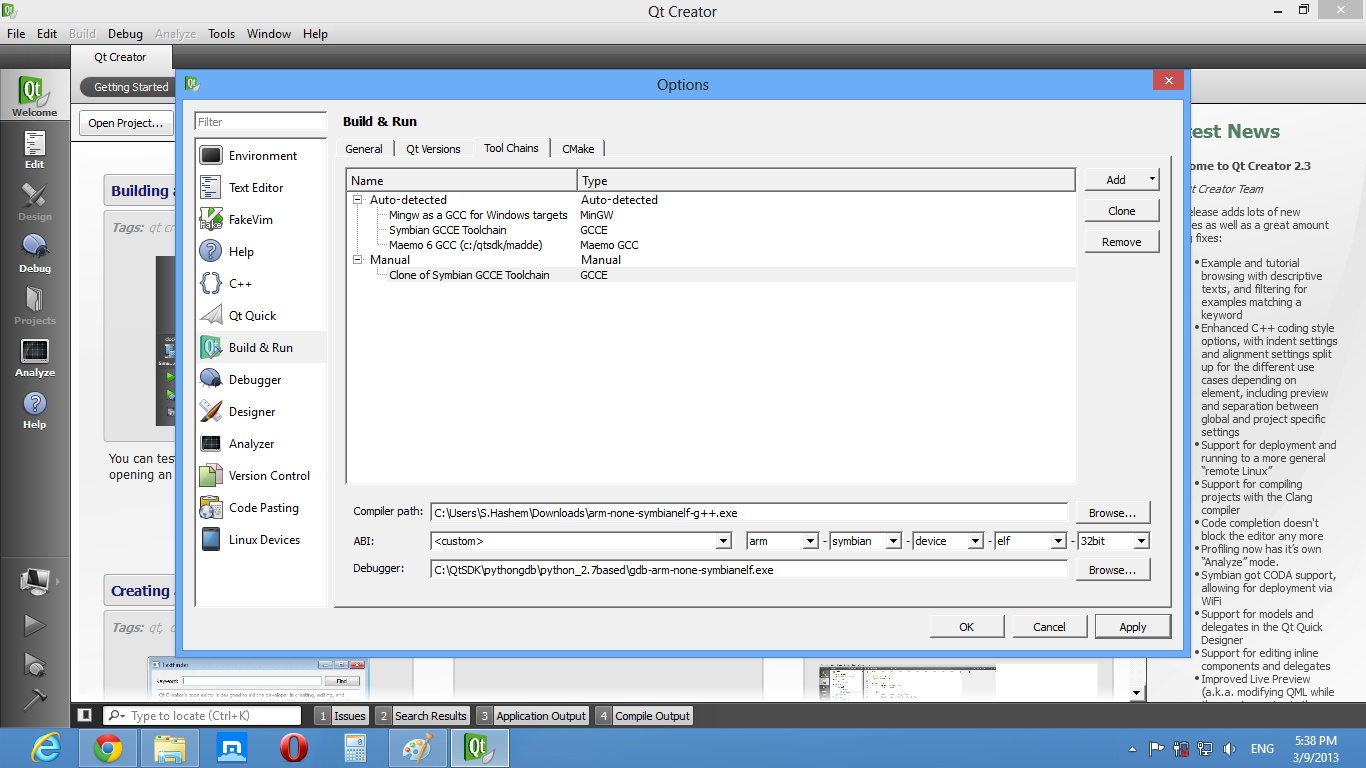 Basically, you should have GCCE 4.6.3 that is mentioned in the README.md. To add this compiler, you need to select Add->GCCE in the Toolchains.