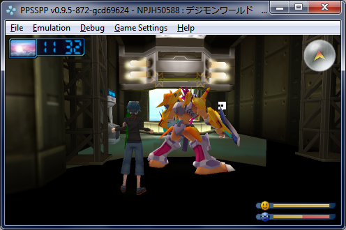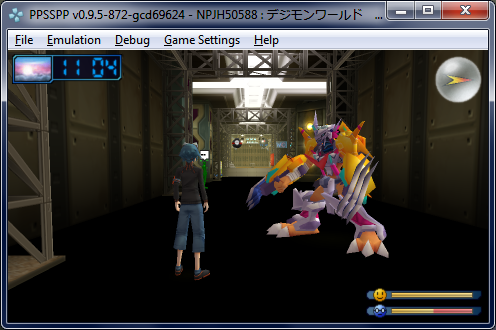 Glitch (used v0.9.1-2311-g13b8a5d to get this screenshot): Fixed (used v0.9.5-527-g21bafd5 to get this screenshot): And now speedwise it feels like if you were playing it on the real PSP (I get 100%-101% speed or 30-31 FPS all the time). I always had good speed on this game on PPSSPP but there were some parts like when you take the digimon to use the bathroom, after that animation of a metal curtain falling down and then up, it took about a couple of seconds after that animation ended and returned you to the game for you to be able to control de tamer, but now you regain control right away. Also moving through the item list is faster as well moving through the options menus (digimon status, attacks, save, etc). I think this game at least on windows builds reached perfection