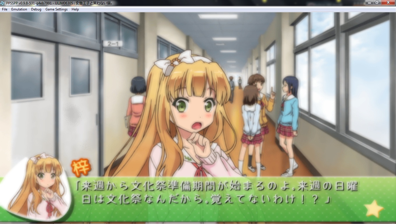 ![]() Genre: Visual Novel Region: JP Format: ISO PPSSPP build: v0.9.8-531-g4eb7991 Game ID: ULJM06305 OS: Windows 7 Home Premium 64-bit(6.1, Build 7601) Compatibility: Playable Notes: I used Miku Bloom shader on this one.. Hmmm just got started from this game so didn't found any bugs yet but it is playable