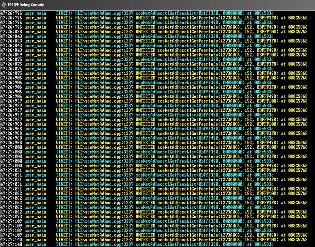 I can paly jpcsp with PPSSPP, but it seems PPSSPP will close adhoc himself jpcsp must be the host Code: 09:27:563 task D[NET]: HLE\sceNet.cpp:170 UNTESTED sceWlanGetSwitchState() |