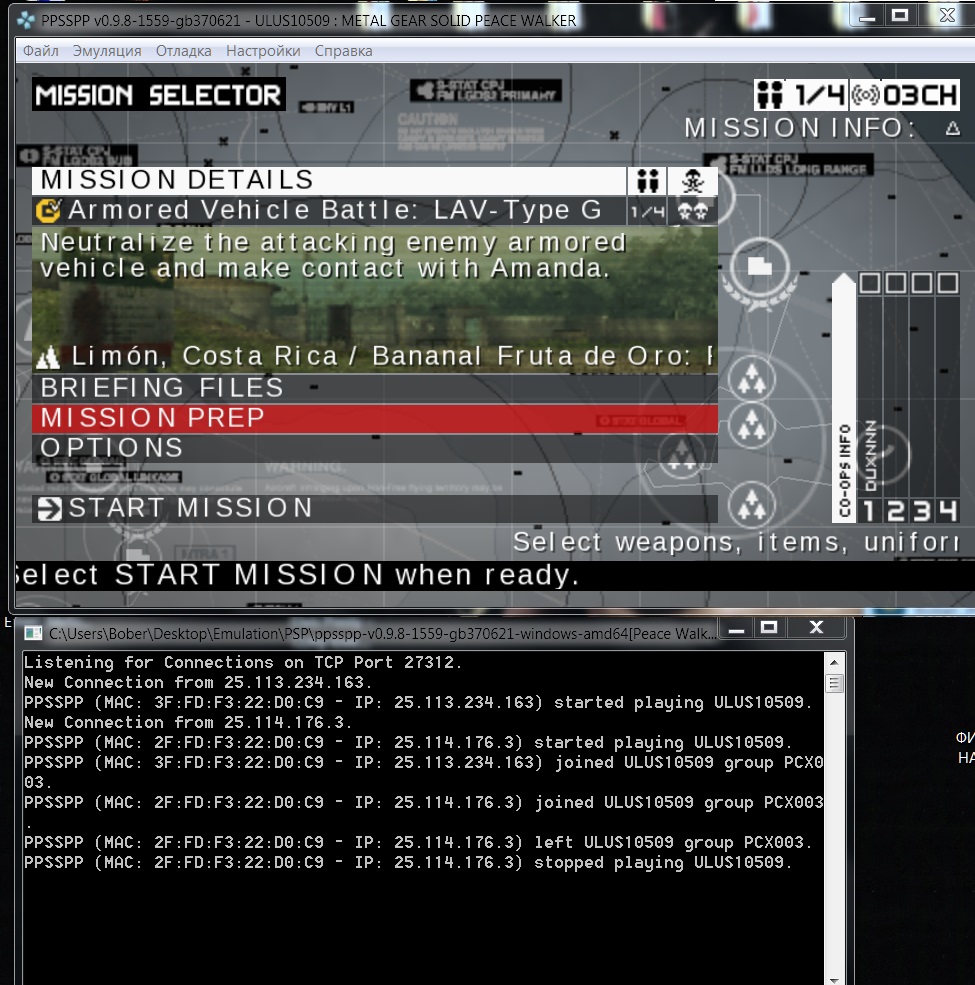 (07-05-2014 03:05 PM)Zinx777 Wrote: Wierd,I cant play Metal Gear Solid: Portable Ops + online agein.Which version of ppsspp do you use? Can you upload adhoc server files? Update: Testing Peace Walker. Second player trying to connected and nothing happened. But server see all players moves. Anyone can check co-op in game? |