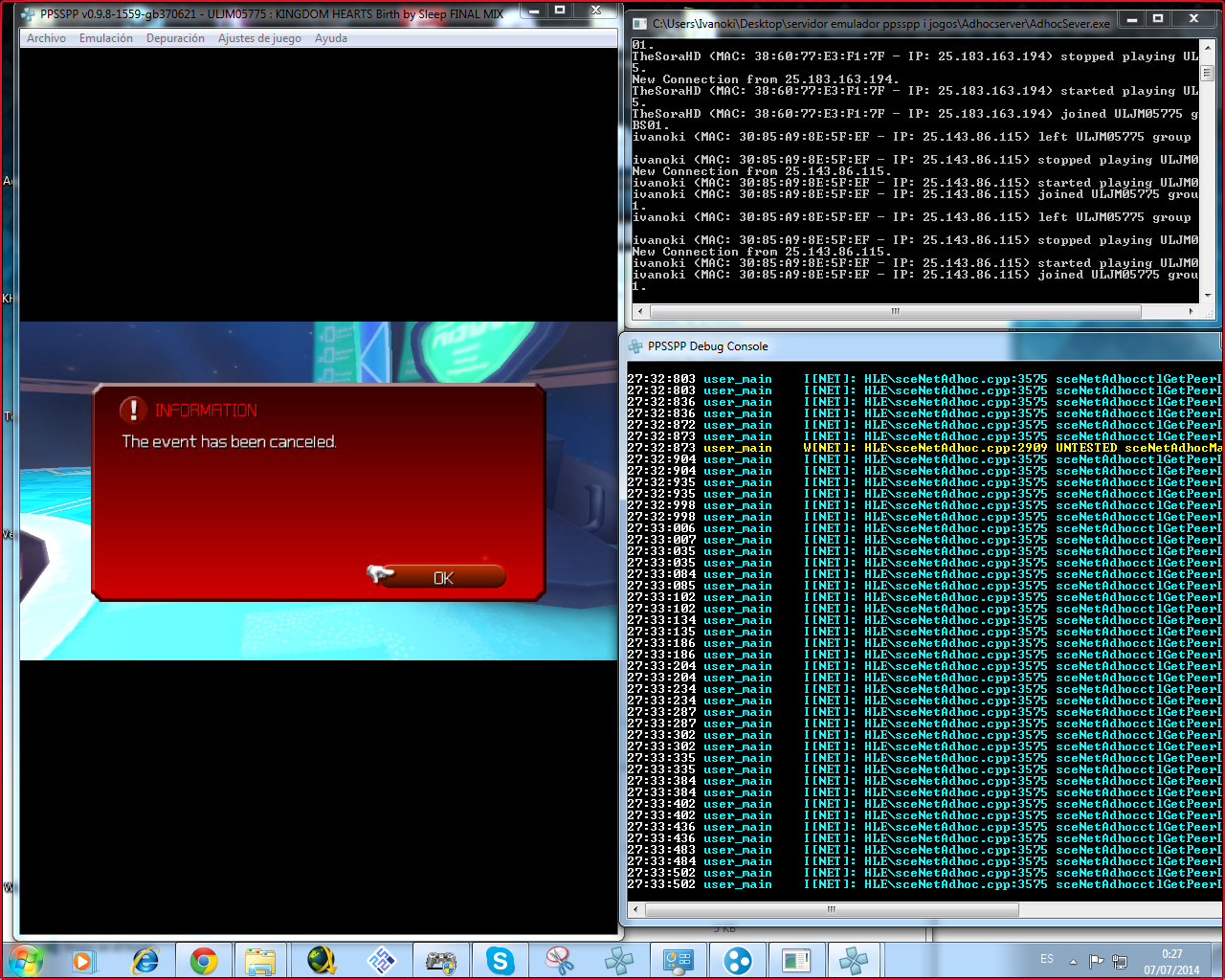 ![]() I wanted to ask if it's possible to fix multiplayer for Birth By Sleep. Someone has asked before about this game and he was pretty close to start a match with a friend. For the first time we could see each other. ![]() After a few tries we could even D-Link between us (but only if the client requests to the host)!!! But, unfortunately, we couldn't start playing. Doing a match like this: Ended up into a message telling that the event was cancelled (I think the problem is given because some "scepollrequest" not giving a proper answer (I don't remember the name of the function exactly)): Or also it crashes the entire emulator or only the game leaving some messages: Finally, but I don't think it's so important, when you go online but then you play solo in the arena, every frame is giving errors to the console: Thanks for your attention and keep the good work up!