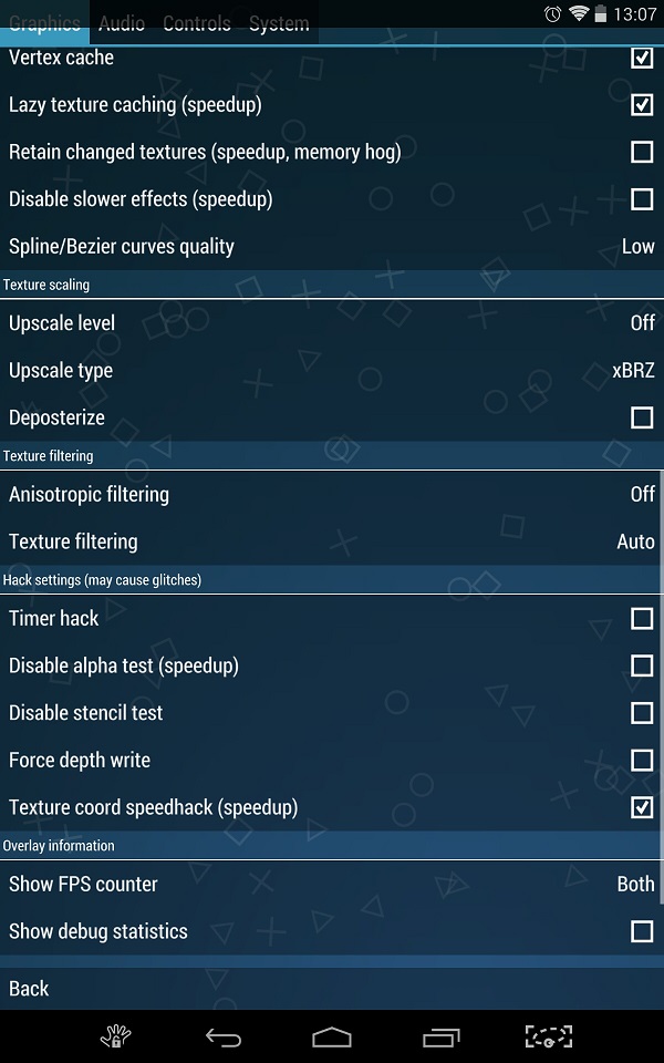 These settings seem to work very well on an NVIDIA Shield Tablet (running on 0.9.9 on Android 4.4.2). The game itself is the English Patched version: