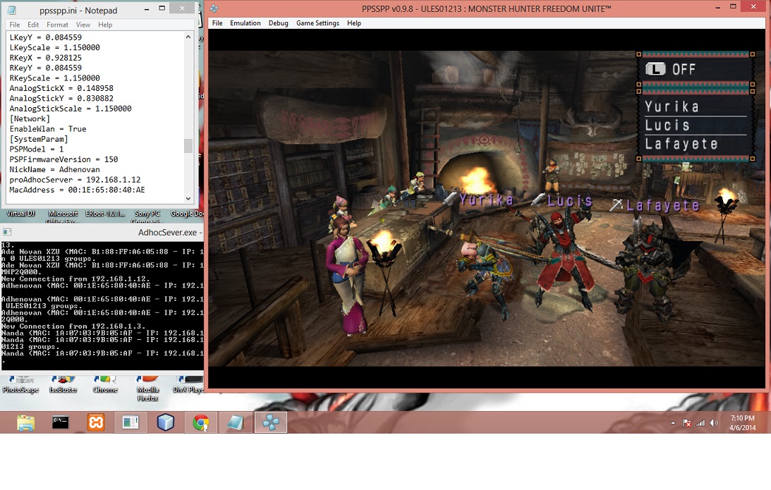 Thanks for the dev Henrik Rydgard , Uknown , Igor Calibria and all other dev for create this awesome emulator feel free to ask any question , if you doing it right it should look like above screenshot Experimenting with adhoc over internet system through Amultios custom ppsspp fork, find me in game Monster Hunter Freedom : Lucis Monster Hunter Freedom Unite : Lucis Monster Hunter Portable 3rd: Lucis |