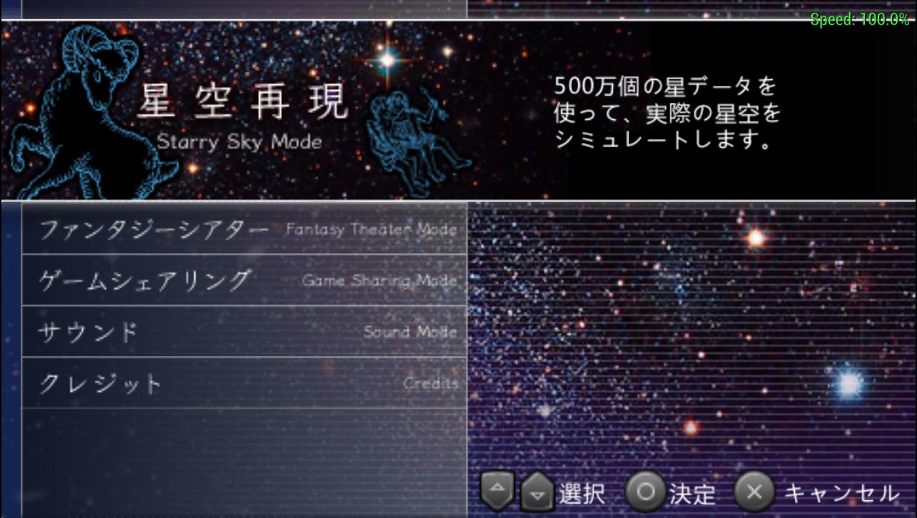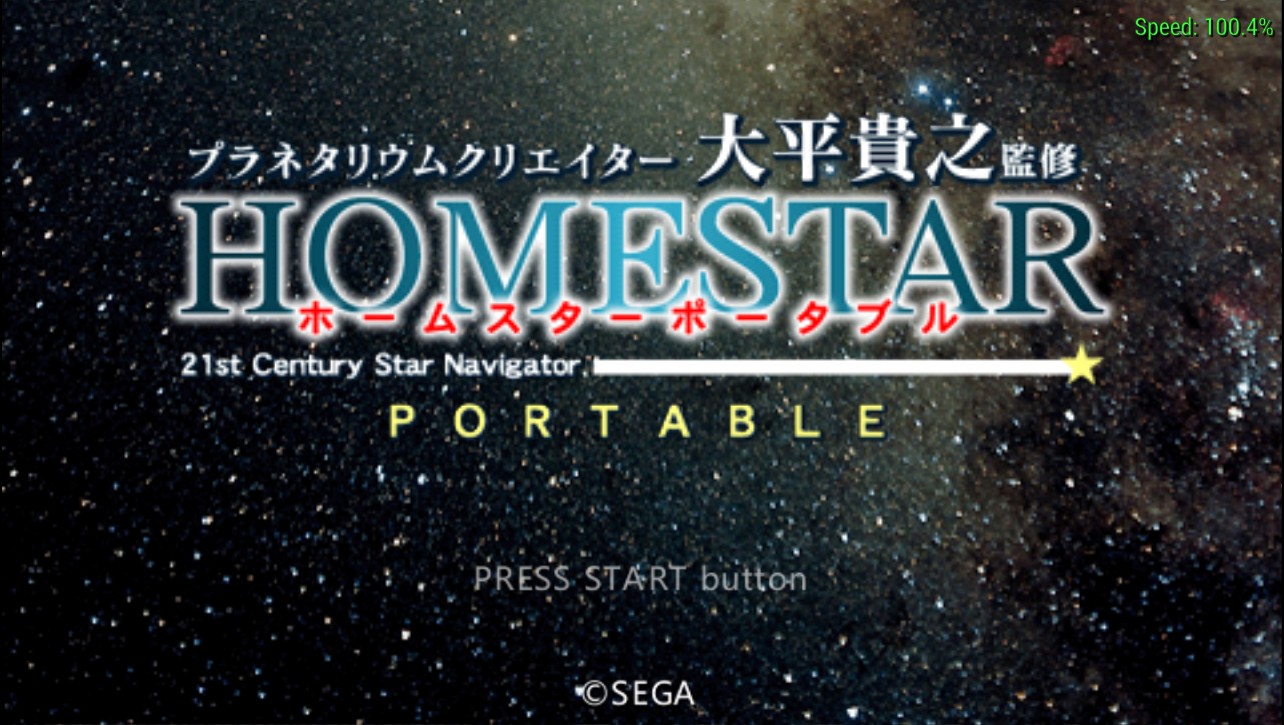 Disc ID: ULJM05184 Genre: Planetarium Simulation Region: JPN Format: ISO Version: PPSSPP 0.9.1-259 x64 OS: Windows 7 x64 Compatibility: Playable Notes: As far as I can tell, it's completely playable. Movies, GFX, BGM, sound, save/load, everything O.K. Log file x64: HomestarPortx64.zip (Size: 27.65 KB / Downloads: 851)